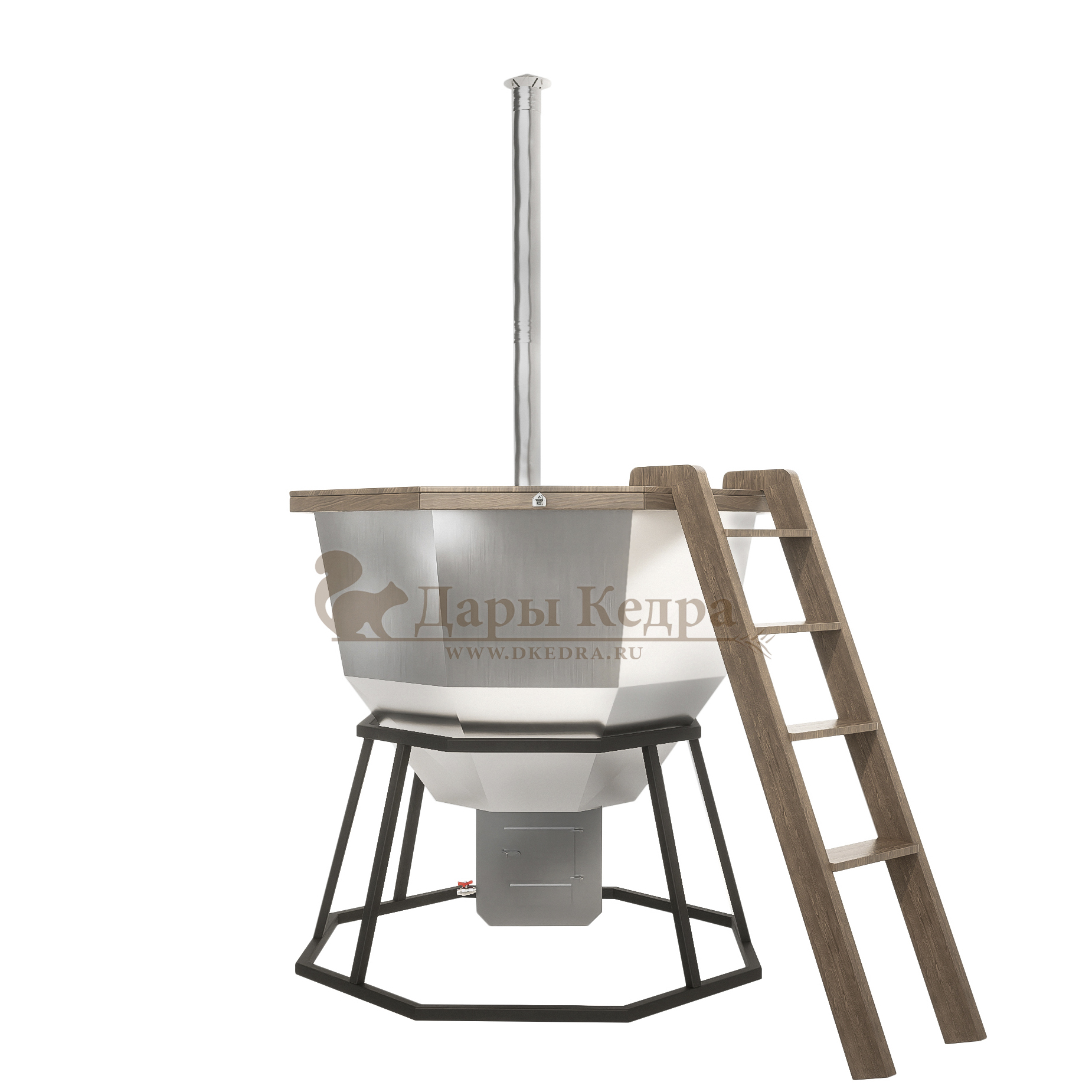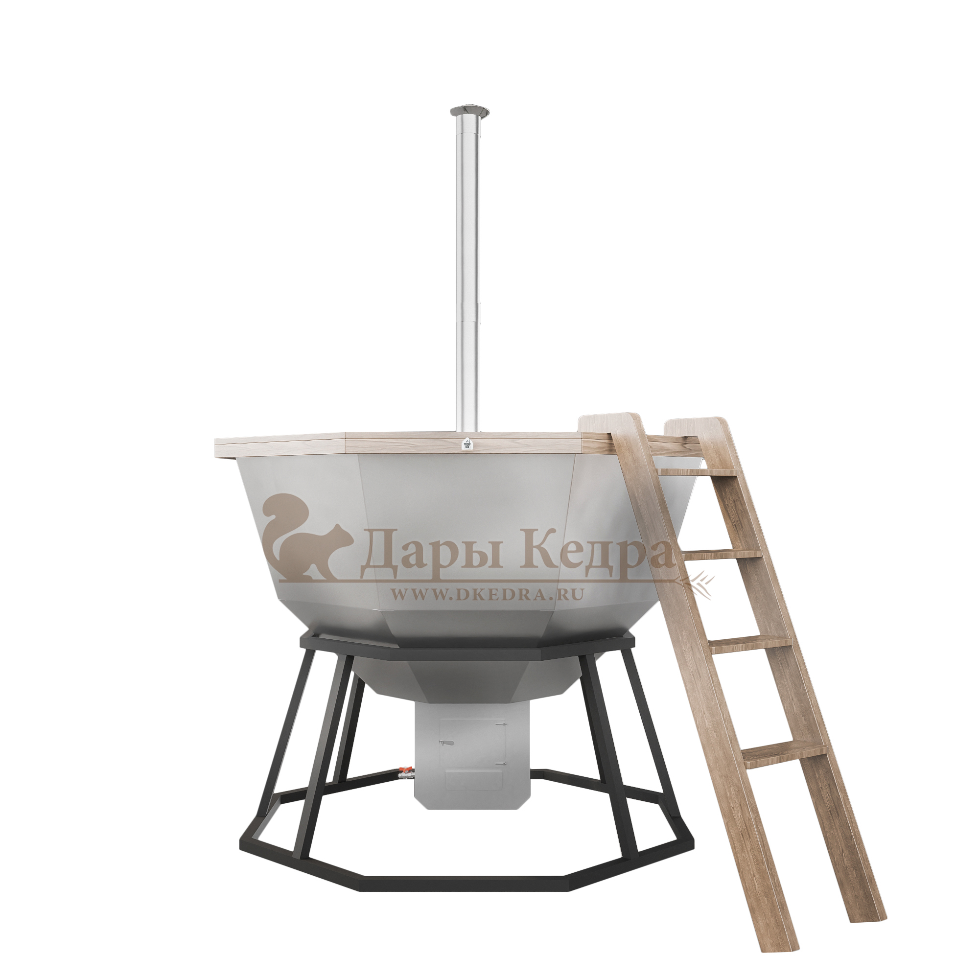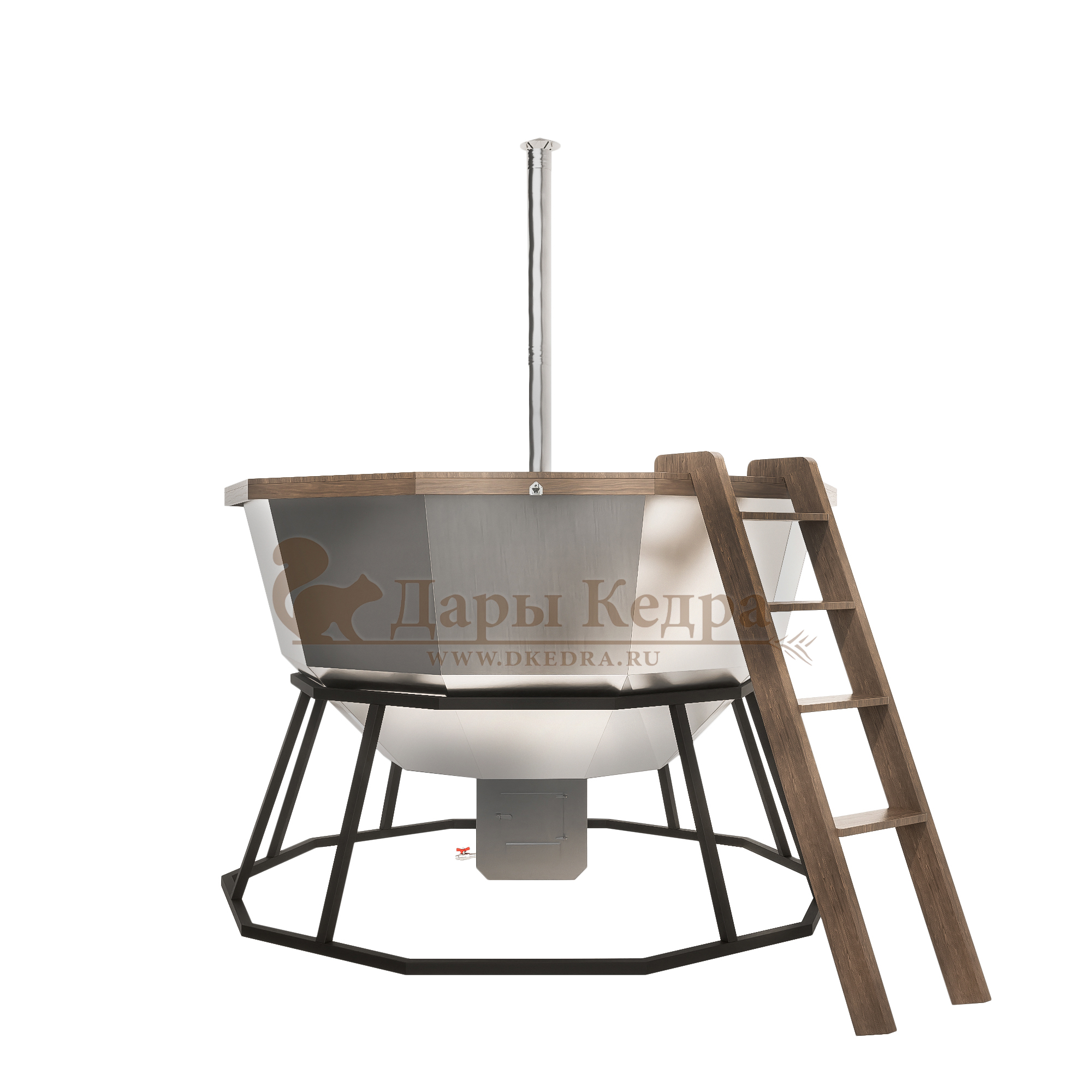 Банный чан из нержавеющей стали Ø-2000 на подставке Банный чан на подставке изготовлен из пищевой стали. Представляет собой большую ёмкость в виде чаши, при нагревании которой можно париться на свежем воздухе. Чан установлен на устойчивую металлическую подставку и оборудован кедровым бортом, скамейками, подспинниками, трапом для ног и приставной лестницей. Нагревание банного чана происходит от обычного костра. Если оборудовать данную модель печью, то банные процедуры можно принимать даже зимой. , ,
