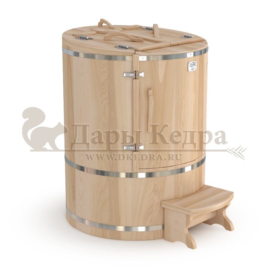 Это круглая фитобочка из кедра увеличенных размеров с толщиной стенок 45 мм. Подходит для людей высокого роста и крупной комплекции. Фитобочка оборудована откидными створками, дверцей и отверстием для головы. Верхний скос изделия делает положение головы более комфортным и улучшает обзор. Во время парения человек сидит внутри кедровой бочки, а голова находится снаружи. Благодаря этому исключается возможность перегрева. Подлокотники из кедра, встроенные ручки на створках и двери делают эксплуатацию более удобной.
