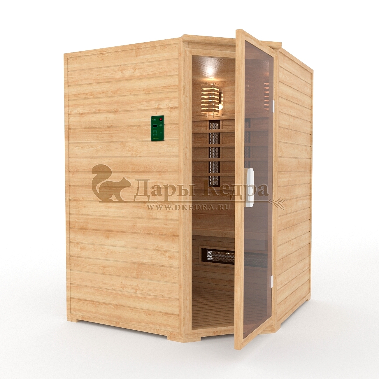 Трёхместная угловая инфракрасная сауна кабина из кедра с керамическими излучателями Это специально оборудованная кедровая кабина для прогрева тела человека сухим теплом. Воздух в таких парных не нагревается. Инфракрасные лучи воздействуют на тело, равномерно прогревая мышцы, суставы и органы. Керамические излучатели похожи на лампы, имеют высокую температуру нагрева, поэтому защищены противоожоговыми решетками. Тело человека в таких саунах нагревается интенсивнее. Работает кабина за счет электричества. Установка сауны в угол, позволяет рационально использовать пространство помещения. Подходит как для домашнего использования, так и для коммерции. Обращаем Ваше внимание что в стандартную комплектацию входит трапик для ног, но вы можете его заменить на цельный пол совершенно бесплатно! Целебная древесина кедра и инфракрасные лучи благотворно влияют на организм человека в целом. При регулярном использовании инфракрасной сауны укрепляется иммунитет, улучшается кровообращение и состояние кожи, выводятся токсины.