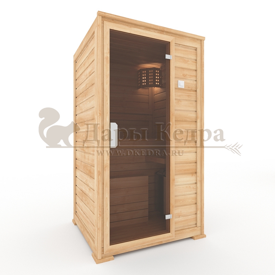 Одноместная финская сауна кабина из кедра с электрокаменкой Это специально оборудованная готовая деревянная кабина для сухого и влажного парения. Электропечь нагревает пространство внутри и позволяет сбрызгивать камни водой, слегка увлажняя воздух. Такая процедура позволяет избежать перегрева. Сауна обшита снаружи и внутри кедровой вагонкой и имеет теплоизоляционный слой. Финская сауна с электропечью подойдет, как для домашнего использования, так и для коммерции. Доставляется в разборном виде щитами, собирается по инструкции с помощью шуруповёрта. Обращаем Ваше внимание, что в стоимость сауны уже включена дверь с закаленным стеклом в раме из кедра с фиксатором и деревянным фасадом справа. Вы можете заменить фасад на цельностеклянный с безрамной дверью за дополнительную плату. Нагреваясь, древесина кедра выделяет полезные вещества-фитонциды, которые благотворно влияют на организм в целом и укрепляют иммунитет.