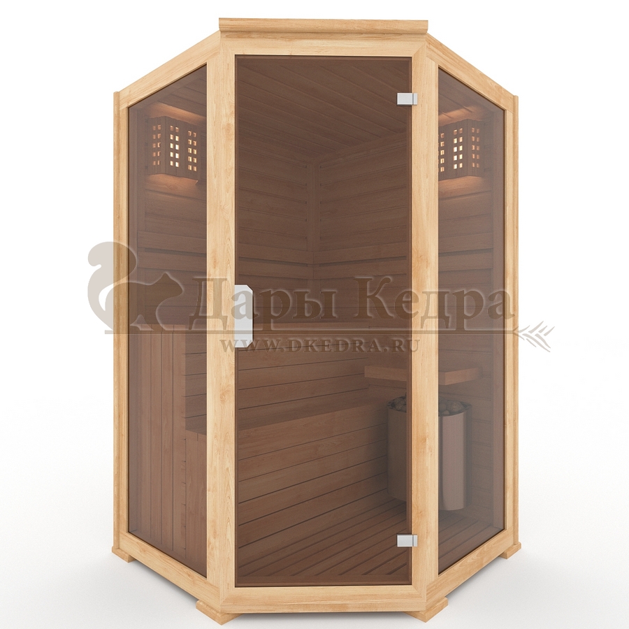 Одноместная угловая финская сауна кабина из кедра с электрокаменкой Это специально оборудованная деревянная кабина для сухого и влажного парения. Электропечь нагревает пространство внутри и позволяет сбрызгивать камни водой, слегка увлажняя воздух. Такая процедура позволяет избежать перегрева. Двойные стенки кабины с теплоизоляционным материалом удерживают тепло. Установка сауны в угол позволяет рационально использовать пространство помещения. Финская сауна с электропечью подойдет как для домашнего использования, так и для коммерции. Доставляется в разборном виде щитами, собирается по инструкции с помощью шуруповёрта. Обращаем Ваше внимание, что в стоимость сауны уже включена дверь с закаленным стеклом в раме из кедра с фиксатором и деревянным фасадом. Вы можете заменить фасад на цельностеклянный с безрамной дверью за дополнительную плату. Нагреваясь, древесина кедра выделяет полезные вещества-фитонциды, которые благотворно влияют на организм в целом и укрепляют иммунитет.