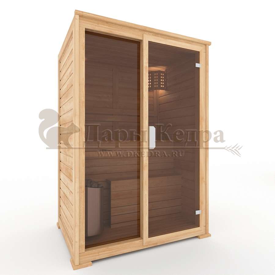 Двухместная финская сауна кабина из кедра с электрокаменкой Это специально оборудованная готовая деревянная кабина для сухого и влажного парения. Электропечь нагревает пространство внутри и позволяет сбрызгивать камни водой, слегка увлажняя воздух. Такая процедура позволяет избежать перегрева. Сауна обшита снаружи и внутри кедровой вагонкой и имеет теплоизоляционный слой. Финская сауна с электропечью подойдет, как для домашнего использования, так и для коммерции. Доставляется в разборном виде щитами, собирается по инструкции с помощью шуруповёрта. Обращаем Ваше внимание, что в стоимость сауны уже включена дверь с закаленным стеклом в раме из кедра с фиксатором и деревянным фасадом справа. Вы можете заменить фасад на цельностеклянный с безрамной дверью за дополнительную плату. Нагреваясь, древесина кедра выделяет полезные вещества-фитонциды, которые благотворно влияют на организм в целом и укрепляют иммунитет.