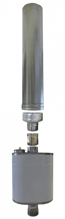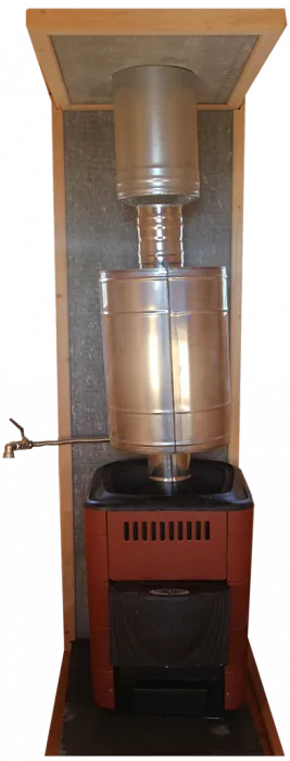 Также для комфортной эксплуатации парной из кедра предусмотрена в комплектации дровяная печь Термофор с трубой и дымоходом в сборе. Печь соединена с баком для горячей воды. Чтобы начать пользоваться баком с водой, необходимо дополнить его краном ¾. Труба устанавливается согласно инструкции от производителя печи, ниже показана последовательность установки трубы.