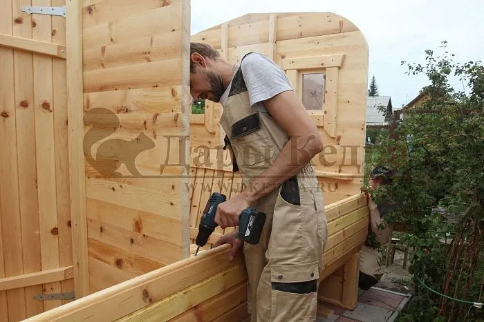 - После того, как каркас банной конструкции собран, ее можно стянуть обручами. Стяжки должны располагаться в прямом доступе. При необходимости их можно будет затянуть или ослабить ключом на 12.