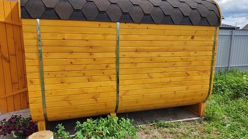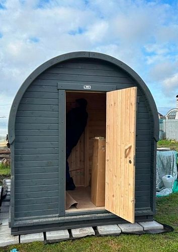 Много читал про такие бани-бочки, долго анализировал, в итоге пришел к мнению, что трехметровая баня-бочка-это оптимальное соотношение цены и качества, пространства. Кстати, в ней вполне хватает места даже для одновременного нахождения 3-4 человек, комфортнее, конечно, вдвоем)). Смотрится на участке красиво! Несколько раз протестировали баньку, остались очень довольными, а впереди целое лето...будем париться почти каждый день))